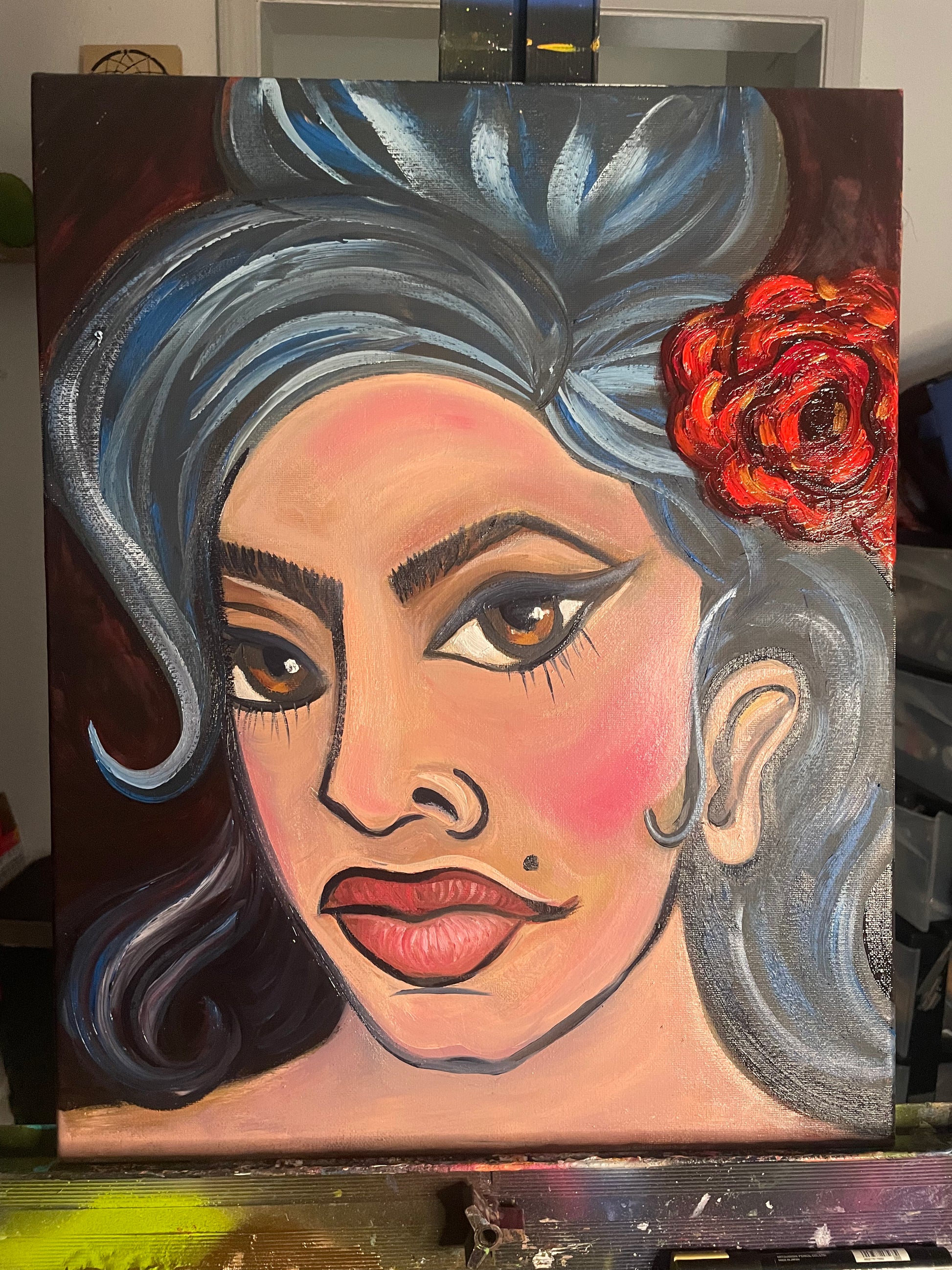 This bold and soulful oil on canvas portrait pays tribute to the legendary Amy Winehouse. With her signature beehive, fierce gaze, and a bright red rose tucked in her hair, this piece captures Amy’s unforgettable spirit and raw vulnerability.