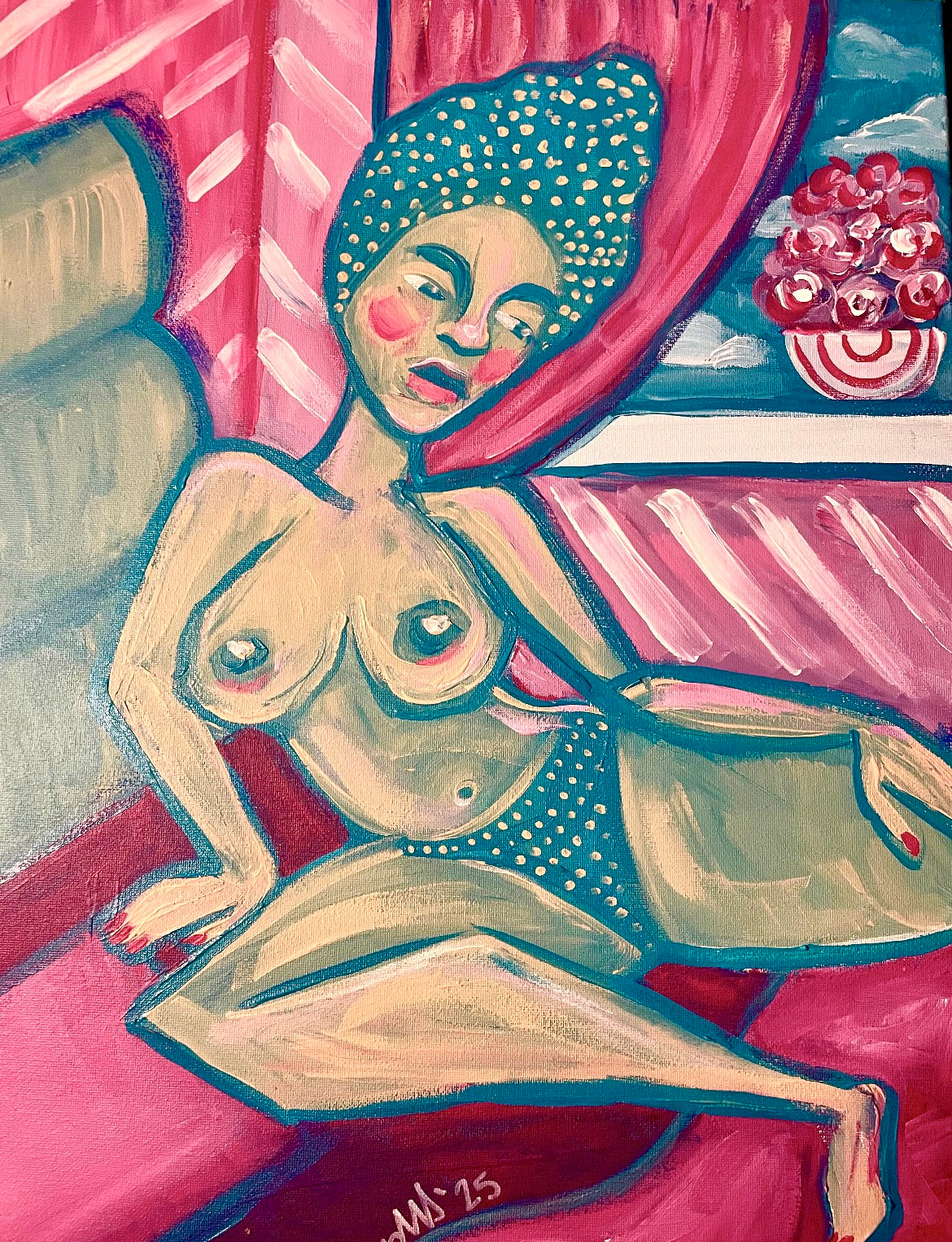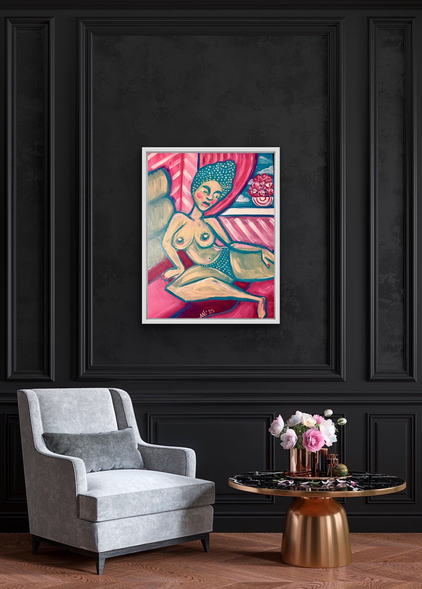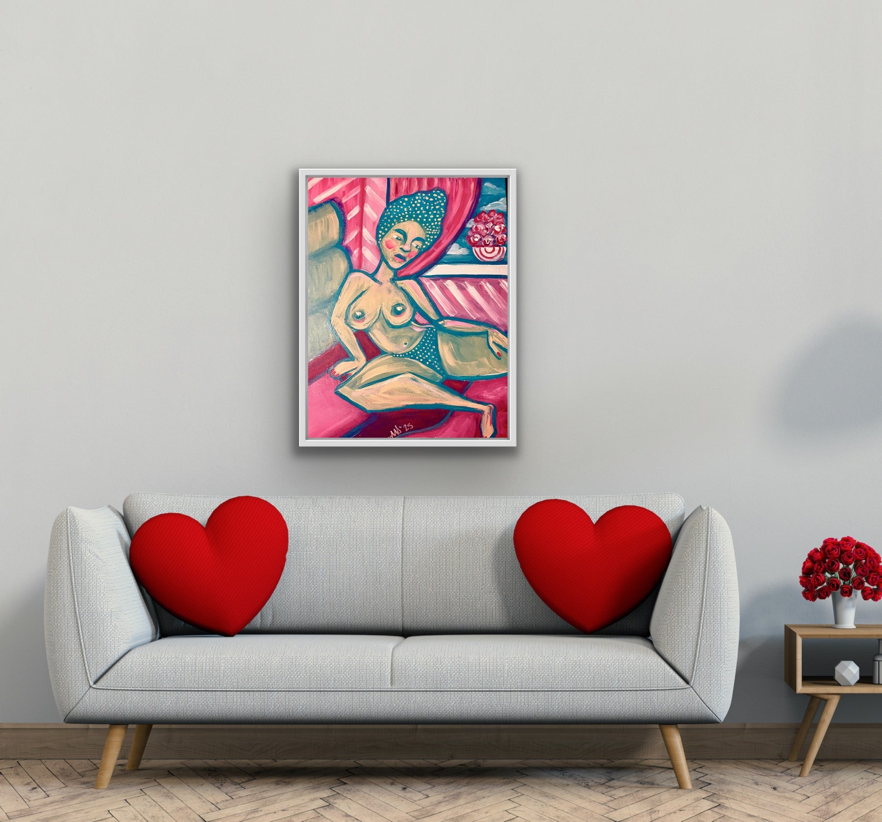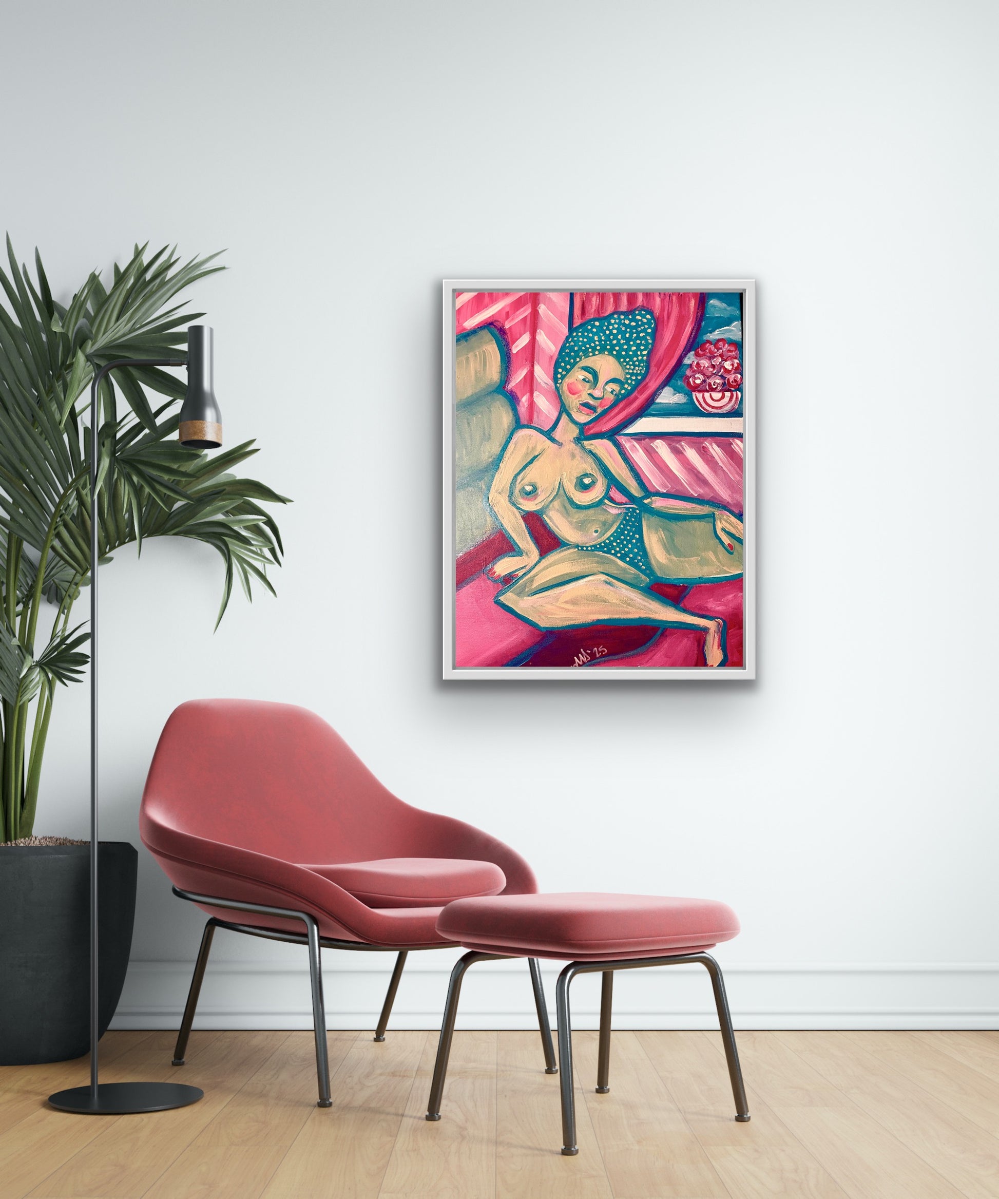 "Experience the powerful emotion of anticipation with The Waiting Game. This stunning 16x20 acrylic painting by Akaimi the Artist captures the longing and desire of a woman awaiting her lover. The limited color palette of blue and pink adds a thoughtful touch, representing the duality of masculinity and femininity in the moment."